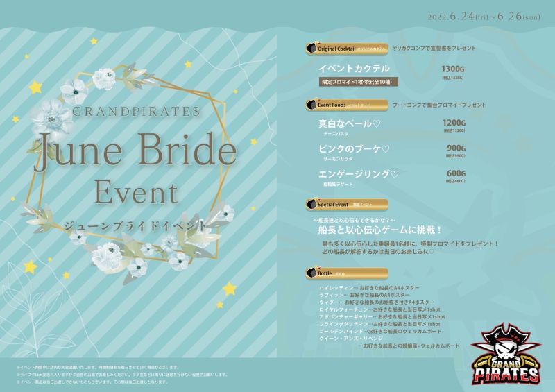 ヨーホー お待たせしました以下、ジューンブライド詳細情報です ジューンブライドイベント 2022年6月24日(金)〜26日(日) イベントカクテル 1300G(1430G)限定ブロマイド1枚付き(全10種)オリカクコンプで宣誓書をプレゼント イベントフード ・真白なベール♡ 1200G(1320G)∟チーズパスタ ・ピンクのブーケ♡ 900G(990G)∟サーモンサラダ ・エンゲージリング♡ 600G(660G)∟指輪風デザート フードコンプで集合ブロマイドプレゼント ボトル特典ハイレッディン… お好きな船長のA4ポスターラフィット… お好きな船長のA4ポスターウィダー… お好きな船長のお絵描き付きA4ポスターロイヤルフォーチュン…お好きな船長と当日写メ1shotアドベンチャーギャリー…お好きな船長と当日写メ1shotフライングダッチマン…お好きな船長と当日写メ1shotゴールデンハインド…お好きな船長のウェルカムボードクイーン・アンズ・リベンジ…お好きな船長との婚姻届+ウェルカムボード お楽しみ会〜船長達と以心伝心できるかな?〜船長と以心伝心ゲームに挑戦!最も多く以心伝心した乗組員1名様に、特製ブロマイドをプレゼントどの船長が解答するかは当日のお楽しみに♡ 船長達と甘い楽しい思い出を作りませんか 皆の乗船、待ってるよー