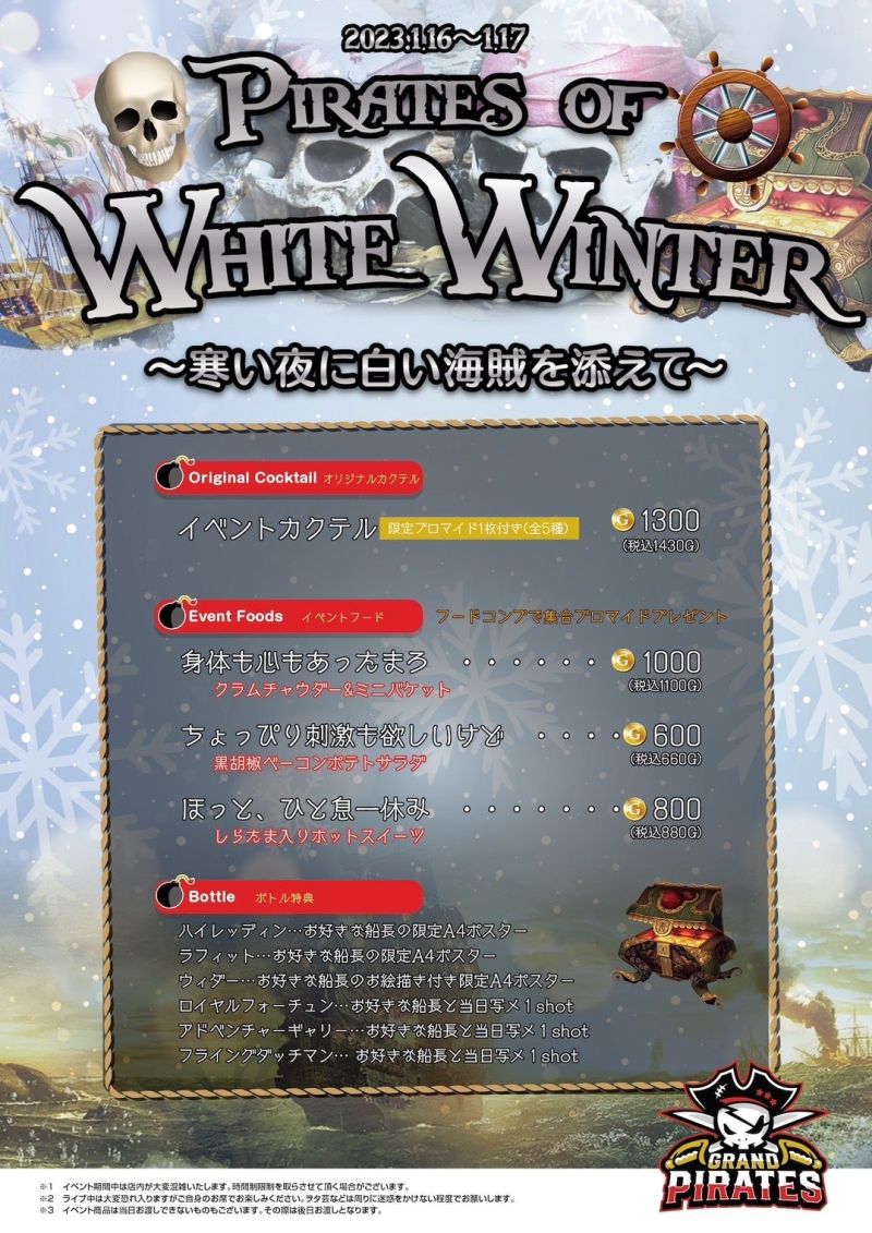 ヨーホー お待たせしました以下、イベントの詳細情報です   Pirates of White Winter〜寒い夜に白い海賊を添えて〜2023年1月16日(月)・17日(火)  イベントカクテル 1300G(1430G)限定ブロマイド1枚付き(全5種)  限定ホワイトメニュー 身体も心もあったまろ 1000G(1100G)∟クラムチャウダー&ミニバケット ちょっぴり刺激も欲しいけど 600G(660G)∟黒胡椒ベーコンポテサラ ほっと、ひと息一休み 800G(880G)∟しらたま入りホットスイーツ フードコンプで集合ブロマイドプレゼント  ボトル特典ハイレッディン…お好きな船長の限定A4ポスターラフィット…お好きな船長の限定A4ポスターウィダー…お好きな船長のお絵描き付き限定A4ポスターロイヤルフォーチュン…お好きな船長と当日写メ1shotアドベンチャーギャリー…お好きな船長と当日写メ1shotフライングダッチマン… お好きな船長と当日写メ1shot   どんなイベント航海になるのかな 皆の乗船、待ってるよー