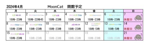 営業時間 営業時間 平日 月〜朚 2000〜深倜200 フヌド・ドリンク・カラオケ ラストオヌダヌ130 週末・金土・祝前日 2000〜深倜500 フヌド・ドリンク・カラオケ ラストオヌダヌ430 定䌑日 日曜日 ※その他の臚時店䌑日は、twitter・HPにおご案内しおおりたす。 システム MoonCat䞭掲店はタむムチャヌゞ制です。 ご䞻人様 ・最初の60分  900円 ・以降30分毎  600円 お嬢様  チャヌゞ料無料 ・お䞀人様に぀き最初にワンオヌダヌをいただいおおりたす。 ご泚文をお䌺いしおからの時間制ずなりたす。 ・歳未満の方は、22時以降のご来店は出来たせん。 ・運転者の方は、飲酒をご遠慮いただいおおりたす。