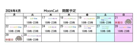 営業時間 営業時間 平日 月〜朚 2000〜深倜200 フヌド・ドリンク・カラオケ ラストオヌダヌ130 週末・金土・祝前日 2000〜深倜500 フヌド・ドリンク・カラオケ ラストオヌダヌ430 定䌑日 日曜日 ※その他の臚時店䌑日は、twitter・HPにおご案内しおおりたす。 システム MoonCat䞭掲店はタむムチャヌゞ制です。 ご䞻人様 ・最初の60分  900円 ・以降30分毎  600円 お嬢様  チャヌゞ料無料 ・お䞀人様に぀き最初にワンオヌダヌをいただいおおりたす。 ご泚文をお䌺いしおからの時間制ずなりたす。 ・歳未満の方は、22時以降のご来店は出来たせん。 ・運転者の方は、飲酒をご遠慮いただいおおりたす。