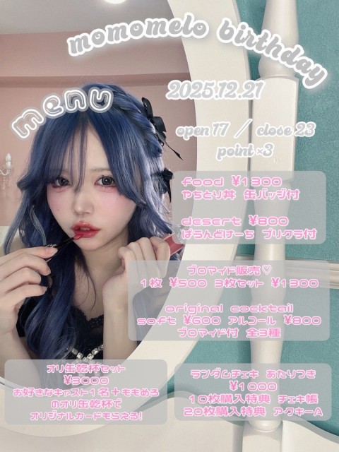 12/8(月)、9(火) 2日間を休業日とさせていただきます。 10日(水)18時からの営業となりますのでよろしくお願いします。 たくさんのご来店、お待ちしてます! 近日イベント予定 12/13,14 イベント予定 12/21 ももめろ生誕 eve https://t.co/aSigZ7aKXn