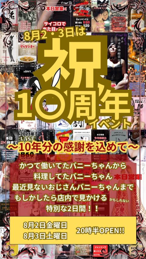 2024年8月2日で ✨10周年✨を迎えることとなりました🎉 そこで!! 8月2日金曜日 8月3日土曜日 に、10周年イベントをやりたいと思います👯‍♀️ 皆様に楽しんでいただけるようなイベントにしていこうと思ってますので顔を出していただけるだけで嬉しく思います🙇‍♀️ 皆様のご来店お待ちしております🐇 https://t.co/6ct2NxOVgk