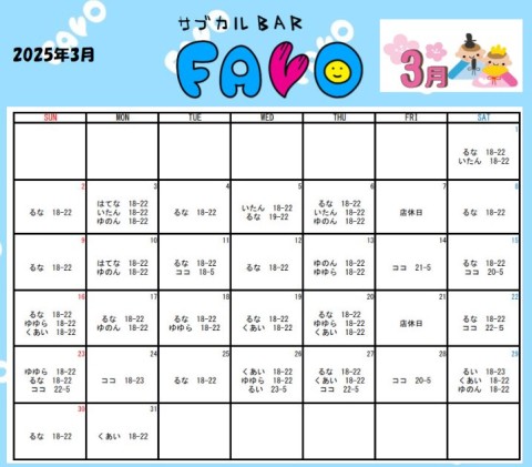 | 営業時間 | 平日 18:00〜24:00 週末 18:00〜5:00 | ||||||||||||||