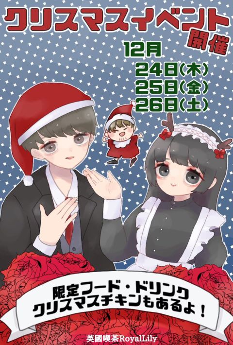 🎄クリスマスイベント🎄 3日開催でございます🎉 使用人共がクリスマスににあったコスチュームでお給仕をします‼️ もちろん限定フード&ドリンクありますのでよろしくお願いいたします‼️ お楽しみに‼️ https://t.co/Vmnge7rAek