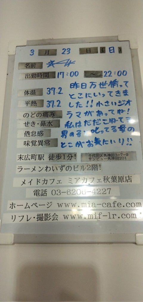| å¶æ¥æé | âãã¢ã«ãã§æ±äº¬åºïŒã¡ã€ãã«ãã§ïŒhttp://www.mia-cafe.com/ãâ â¡å¹³æ¥ãæïœéãïŒïŒïŒïŒïŒïœïŒïŒïŒïŒïŒ â¡åæã»æ¥æã»ç¥æ¥ãïŒïŒïŒïŒïŒïœïŒïŒïŒïŒïŒ â å®äŒæ¥ããªãïŒ2019幎1æããå®äŒæ¥å»æ¢ïŒ â¡ã©ã¹ããªãŒããŒãéåºã®ïŒïŒåå ãïŒïŒïŒïŒïŒéåºã®å ŽåâïŒïŒïŒïŒïŒã©ã¹ããªãŒããŒ å¶æ¥æ¥ãåºå€ç¶æ³ã«ã€ããŠã¯ãã¡ãã http://pandaland.cutegirl.jp/mif/c_cms_csv/sch_top.php âãã¢ãªã©ïŒãã©ãæ±äº¬åºïŒæ®åœ±äŒïŒãªãã¬ïŒhttp://www.mif-lr.com/ãâ â¡å šæ¥ãïŒïŒïŒïŒïŒãïŒïŒïŒïŒïŒãã§ãããªã©ã¯ãŒãŒã·ã§ã³åºå€ã¹ã¿ãããããæé垯ã®ã¿å¶æ¥ã§ãã â å®äŒæ¥ã¯äžå®äŒïŒåºå€ã¹ã¿ãããããæé垯ã®å¶æ¥ïŒ â¡æçµåä»ãéåºã®ïŒïŒåå ãïŒïŒïŒïŒïŒéåºã®å ŽåâïŒïŒïŒïŒïŒïŒïŒïŒïŒïŒïŒè¿ã«æœè¡æéãçµããã³ãŒã¹ïŒ â»é«æ ¡çäžå¯ âæ·±å€å¶æ¥ã«ã€ããŠã¯ãå ¬åŒãµã€ãå³äžã® http://market.chu.jp/schedule1/sche37.cgi ãã¢ã°ã«ãŒãç·åã¹ã±ãžã¥ãŒã«ïŒïŒ°ïŒ£ã»ã¹ããïŒ http://market.chu.jp/schedule1/sche37.cgi?dm=1 ãã¢ã°ã«ãŒãç·åã¹ã±ãžã¥ãŒã«ïŒã¬ã©æºåž¯ïŒ ãã芧ãã ãããåç¥æ¥ã®ã¿å¶æ¥ãšãªããŸããåç¥æ¥ä»¥å€ã¯æ·±å€å¶æ¥ããããŠãããŸããã æ·±å€å¶æ¥å¯Ÿè±¡æ¥ãïŒïŒïŒïŒïŒãç¿æïŒïŒïŒïŒïŒïŒ¬ïŒïŒ¯ïŒïŒïŒïŒïŒïŒ | ||||||||||||||