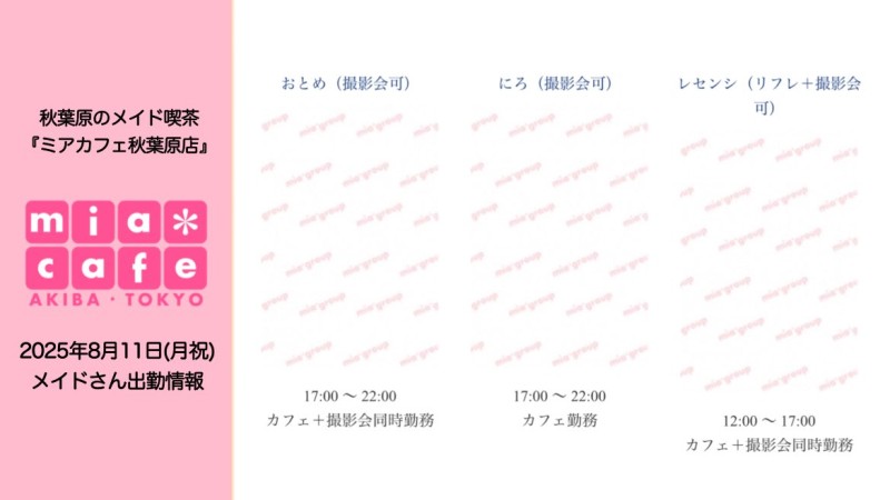 å¶æ¥æé | âãã¢ã«ãã§æ±äº¬åºïŒã¡ã€ãã«ãã§ïŒhttp://www.mia-cafe.com/ãâ â¡å¹³æ¥ãæïœéãïŒïŒïŒïŒïŒïœïŒïŒïŒïŒïŒ â¡åæã»æ¥æã»ç¥æ¥ãïŒïŒïŒïŒïŒïœïŒïŒïŒïŒïŒ â å®äŒæ¥ããªãïŒ2019幎1æããå®äŒæ¥å»æ¢ïŒ â¡ã©ã¹ããªãŒããŒãéåºã®ïŒïŒåå ãïŒïŒïŒïŒïŒéåºã®å ŽåâïŒïŒïŒïŒïŒã©ã¹ããªãŒããŒ å¶æ¥æ¥ãåºå€ç¶æ³ã«ã€ããŠã¯ãã¡ãã http://pandaland.cutegirl.jp/mif/c_cms_csv/sch_top.php âãã¢ãªã©ïŒãã©ãæ±äº¬åºïŒæ®åœ±äŒïŒãªãã¬ïŒhttp://www.mif-lr.com/ãâ â¡å šæ¥ãïŒïŒïŒïŒïŒãïŒïŒïŒïŒïŒãã§ãããªã©ã¯ãŒãŒã·ã§ã³åºå€ã¹ã¿ãããããæé垯ã®ã¿å¶æ¥ã§ãã â å®äŒæ¥ã¯äžå®äŒïŒåºå€ã¹ã¿ãããããæé垯ã®å¶æ¥ïŒ â¡æçµåä»ãéåºã®ïŒïŒåå ãïŒïŒïŒïŒïŒéåºã®å ŽåâïŒïŒïŒïŒïŒïŒïŒïŒïŒïŒïŒè¿ã«æœè¡æéãçµããã³ãŒã¹ïŒ â»é«æ ¡çäžå¯ âæ·±å€å¶æ¥ã«ã€ããŠã¯ãå ¬åŒãµã€ãå³äžã® http://market.chu.jp/schedule1/sche37.cgi ãã¢ã°ã«ãŒãç·åã¹ã±ãžã¥ãŒã«ïŒïŒ°ïŒ£ã»ã¹ããïŒ http://market.chu.jp/schedule1/sche37.cgi?dm=1 ãã¢ã°ã«ãŒãç·åã¹ã±ãžã¥ãŒã«ïŒã¬ã©æºåž¯ïŒ ãã芧ãã ãããåç¥æ¥ã®ã¿å¶æ¥ãšãªããŸããåç¥æ¥ä»¥å€ã¯æ·±å€å¶æ¥ããããŠãããŸããã æ·±å€å¶æ¥å¯Ÿè±¡æ¥ãïŒïŒïŒïŒïŒãç¿æïŒïŒïŒïŒïŒïŒ¬ïŒïŒ¯ïŒïŒïŒïŒïŒïŒ | ||||||||||||||