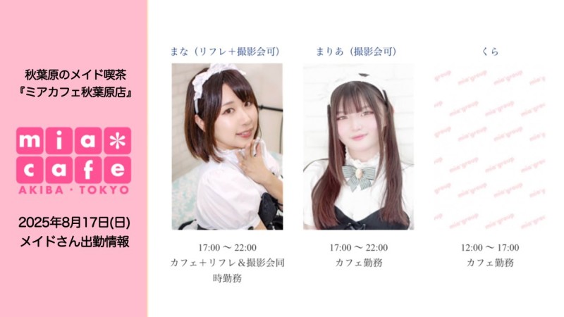 å¶æ¥æé | âãã¢ã«ãã§æ±äº¬åºïŒã¡ã€ãã«ãã§ïŒhttp://www.mia-cafe.com/ãâ â¡å¹³æ¥ãæïœéãïŒïŒïŒïŒïŒïœïŒïŒïŒïŒïŒ â¡åæã»æ¥æã»ç¥æ¥ãïŒïŒïŒïŒïŒïœïŒïŒïŒïŒïŒ â å®äŒæ¥ããªãïŒ2019幎1æããå®äŒæ¥å»æ¢ïŒ â¡ã©ã¹ããªãŒããŒãéåºã®ïŒïŒåå ãïŒïŒïŒïŒïŒéåºã®å ŽåâïŒïŒïŒïŒïŒã©ã¹ããªãŒããŒ å¶æ¥æ¥ãåºå€ç¶æ³ã«ã€ããŠã¯ãã¡ãã http://pandaland.cutegirl.jp/mif/c_cms_csv/sch_top.php âãã¢ãªã©ïŒãã©ãæ±äº¬åºïŒæ®åœ±äŒïŒãªãã¬ïŒhttp://www.mif-lr.com/ãâ â¡å šæ¥ãïŒïŒïŒïŒïŒãïŒïŒïŒïŒïŒãã§ãããªã©ã¯ãŒãŒã·ã§ã³åºå€ã¹ã¿ãããããæé垯ã®ã¿å¶æ¥ã§ãã â å®äŒæ¥ã¯äžå®äŒïŒåºå€ã¹ã¿ãããããæé垯ã®å¶æ¥ïŒ â¡æçµåä»ãéåºã®ïŒïŒåå ãïŒïŒïŒïŒïŒéåºã®å ŽåâïŒïŒïŒïŒïŒïŒïŒïŒïŒïŒïŒè¿ã«æœè¡æéãçµããã³ãŒã¹ïŒ â»é«æ ¡çäžå¯ âæ·±å€å¶æ¥ã«ã€ããŠã¯ãå ¬åŒãµã€ãå³äžã® http://market.chu.jp/schedule1/sche37.cgi ãã¢ã°ã«ãŒãç·åã¹ã±ãžã¥ãŒã«ïŒïŒ°ïŒ£ã»ã¹ããïŒ http://market.chu.jp/schedule1/sche37.cgi?dm=1 ãã¢ã°ã«ãŒãç·åã¹ã±ãžã¥ãŒã«ïŒã¬ã©æºåž¯ïŒ ãã芧ãã ãããåç¥æ¥ã®ã¿å¶æ¥ãšãªããŸããåç¥æ¥ä»¥å€ã¯æ·±å€å¶æ¥ããããŠãããŸããã æ·±å€å¶æ¥å¯Ÿè±¡æ¥ãïŒïŒïŒïŒïŒãç¿æïŒïŒïŒïŒïŒïŒ¬ïŒïŒ¯ïŒïŒïŒïŒïŒïŒ | ||||||||||||||
