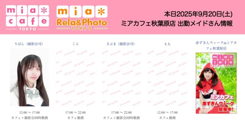 å¶æ¥æé | âãã¢ã«ãã§æ±äº¬åºïŒã¡ã€ãã«ãã§ïŒhttp://www.mia-cafe.com/ãâ â¡å¹³æ¥ãæïœéãïŒïŒïŒïŒïŒïœïŒïŒïŒïŒïŒ â¡åæã»æ¥æã»ç¥æ¥ãïŒïŒïŒïŒïŒïœïŒïŒïŒïŒïŒ â å®äŒæ¥ããªãïŒ2019幎1æããå®äŒæ¥å»æ¢ïŒ â¡ã©ã¹ããªãŒããŒãéåºã®ïŒïŒåå ãïŒïŒïŒïŒïŒéåºã®å ŽåâïŒïŒïŒïŒïŒã©ã¹ããªãŒããŒ å¶æ¥æ¥ãåºå€ç¶æ³ã«ã€ããŠã¯ãã¡ãã http://pandaland.cutegirl.jp/mif/c_cms_csv/sch_top.php âãã¢ãªã©ïŒãã©ãæ±äº¬åºïŒæ®åœ±äŒïŒãªãã¬ïŒhttp://www.mif-lr.com/ãâ â¡å šæ¥ãïŒïŒïŒïŒïŒãïŒïŒïŒïŒïŒãã§ãããªã©ã¯ãŒãŒã·ã§ã³åºå€ã¹ã¿ãããããæé垯ã®ã¿å¶æ¥ã§ãã â å®äŒæ¥ã¯äžå®äŒïŒåºå€ã¹ã¿ãããããæé垯ã®å¶æ¥ïŒ â¡æçµåä»ãéåºã®ïŒïŒåå ãïŒïŒïŒïŒïŒéåºã®å ŽåâïŒïŒïŒïŒïŒïŒïŒïŒïŒïŒïŒè¿ã«æœè¡æéãçµããã³ãŒã¹ïŒ â»é«æ ¡çäžå¯ âæ·±å€å¶æ¥ã«ã€ããŠã¯ãå ¬åŒãµã€ãå³äžã® http://market.chu.jp/schedule1/sche37.cgi ãã¢ã°ã«ãŒãç·åã¹ã±ãžã¥ãŒã«ïŒïŒ°ïŒ£ã»ã¹ããïŒ http://market.chu.jp/schedule1/sche37.cgi?dm=1 ãã¢ã°ã«ãŒãç·åã¹ã±ãžã¥ãŒã«ïŒã¬ã©æºåž¯ïŒ ãã芧ãã ãããåç¥æ¥ã®ã¿å¶æ¥ãšãªããŸããåç¥æ¥ä»¥å€ã¯æ·±å€å¶æ¥ããããŠãããŸããã æ·±å€å¶æ¥å¯Ÿè±¡æ¥ãïŒïŒïŒïŒïŒãç¿æïŒïŒïŒïŒïŒïŒ¬ïŒïŒ¯ïŒïŒïŒïŒïŒïŒ | ||||||||||||||