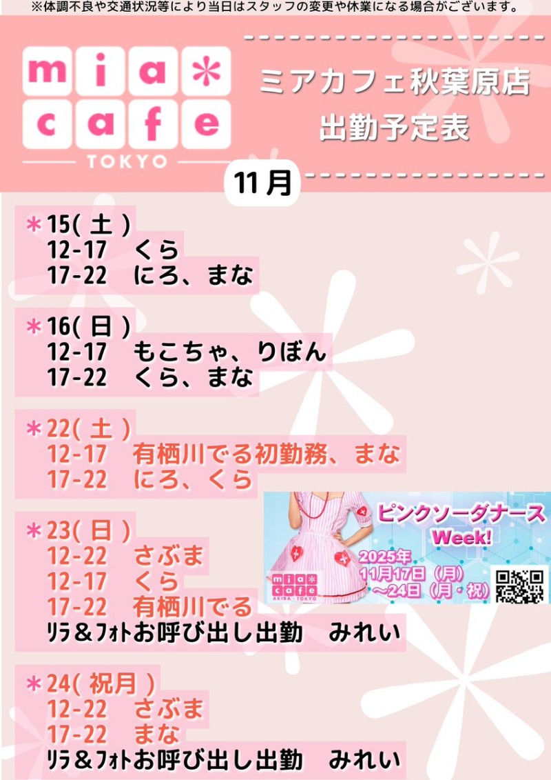 | å¶æ¥æé | âãã¢ã«ãã§æ±äº¬åºïŒã¡ã€ãã«ãã§ïŒhttp://www.mia-cafe.com/ãâ â¡å¹³æ¥ãæïœéãïŒïŒïŒïŒïŒïœïŒïŒïŒïŒïŒ â¡åæã»æ¥æã»ç¥æ¥ãïŒïŒïŒïŒïŒïœïŒïŒïŒïŒïŒ â å®äŒæ¥ããªãïŒ2019幎1æããå®äŒæ¥å»æ¢ïŒ â¡ã©ã¹ããªãŒããŒãéåºã®ïŒïŒåå ãïŒïŒïŒïŒïŒéåºã®å ŽåâïŒïŒïŒïŒïŒã©ã¹ããªãŒããŒ å¶æ¥æ¥ãåºå€ç¶æ³ã«ã€ããŠã¯ãã¡ãã http://pandaland.cutegirl.jp/mif/c_cms_csv/sch_top.php âãã¢ãªã©ïŒãã©ãæ±äº¬åºïŒæ®åœ±äŒïŒãªãã¬ïŒhttp://www.mif-lr.com/ãâ â¡å šæ¥ãïŒïŒïŒïŒïŒãïŒïŒïŒïŒïŒãã§ãããªã©ã¯ãŒãŒã·ã§ã³åºå€ã¹ã¿ãããããæé垯ã®ã¿å¶æ¥ã§ãã â å®äŒæ¥ã¯äžå®äŒïŒåºå€ã¹ã¿ãããããæé垯ã®å¶æ¥ïŒ â¡æçµåä»ãéåºã®ïŒïŒåå ãïŒïŒïŒïŒïŒéåºã®å ŽåâïŒïŒïŒïŒïŒïŒïŒïŒïŒïŒïŒè¿ã«æœè¡æéãçµããã³ãŒã¹ïŒ â»é«æ ¡çäžå¯ âæ·±å€å¶æ¥ã«ã€ããŠã¯ãå ¬åŒãµã€ãå³äžã® http://market.chu.jp/schedule1/sche37.cgi ãã¢ã°ã«ãŒãç·åã¹ã±ãžã¥ãŒã«ïŒïŒ°ïŒ£ã»ã¹ããïŒ http://market.chu.jp/schedule1/sche37.cgi?dm=1 ãã¢ã°ã«ãŒãç·åã¹ã±ãžã¥ãŒã«ïŒã¬ã©æºåž¯ïŒ ãã芧ãã ãããåç¥æ¥ã®ã¿å¶æ¥ãšãªããŸããåç¥æ¥ä»¥å€ã¯æ·±å€å¶æ¥ããããŠãããŸããã æ·±å€å¶æ¥å¯Ÿè±¡æ¥ãïŒïŒïŒïŒïŒãç¿æïŒïŒïŒïŒïŒïŒ¬ïŒïŒ¯ïŒïŒïŒïŒïŒïŒ | ||||||||||||||
