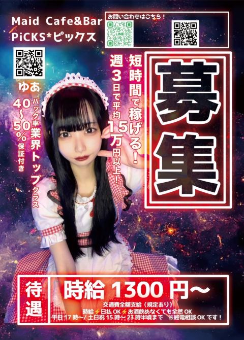 東京1の宇宙コンセプト🚀 ピックスのメイドさんを大募集✨ 🔸18歳~※23時頃まで勤務必須 🔹オリジナル制服4種類 🔸交通費全額支給(条件有) 🔹お散歩少なめ 🔶バック最大50%で保証有り👍🏻 🔹日払い🆗 🔸時給1300円~(研修1200円〜) 🔹今だけ体入有り #新宿 #秋葉原 #歌舞伎町 #コンカフェ #求人 #募集 https://t.co/83c8rnW7MO