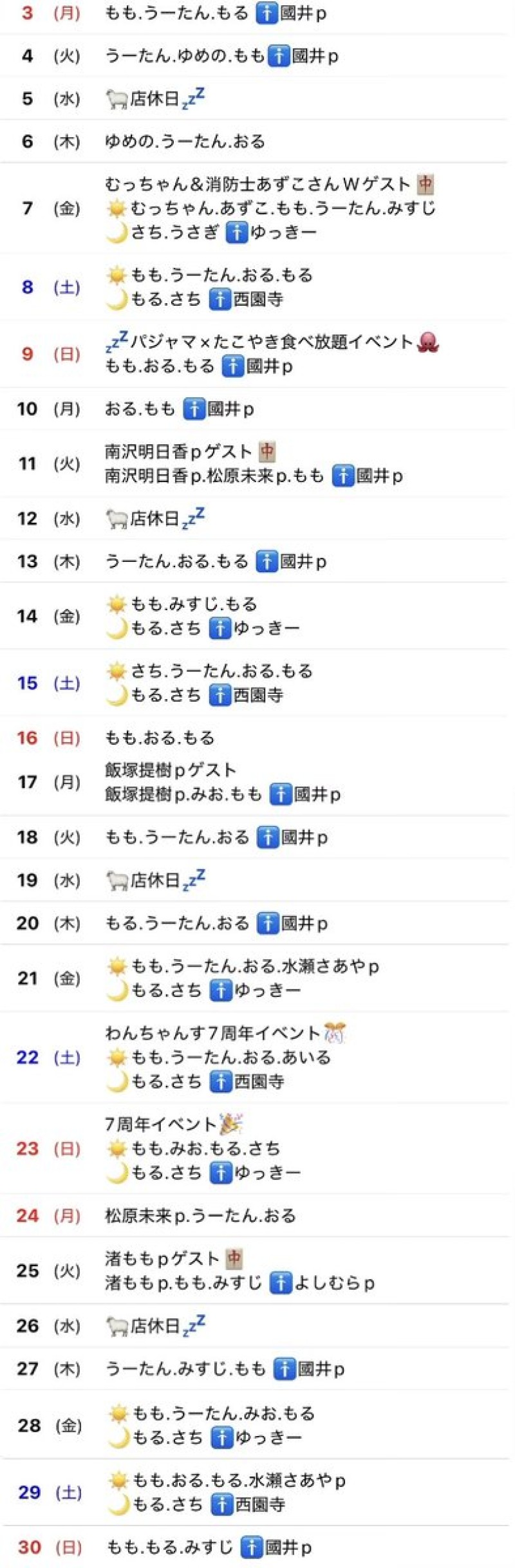 🍁11月シフト表🐿 ⚠️追加、変更ある場合があるので当日のオープンツイートの確認をお願いします🙇‍♂️ 7日むっちゃん&あずこさんゲスト 9日パジャマ×たこやきday 11日南沢明日香pゲスト 17日飯塚提樹pBDゲスト 22日.23日わんちゃんす7周年 25日渚ももpゲスト 29日いい肉の日イベント🍖 #コンカフェ https://t.co/RAOtvt56Uu