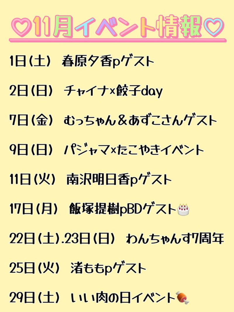 🍁11月シフト表🐿 ⚠️追加、変更ある場合があるので当日のオープンツイートの確認をお願いします🙇‍♂️ 7日むっちゃん&あずこさんゲスト 9日パジャマ×たこやきday 11日南沢明日香pゲスト 17日飯塚提樹pBDゲスト 22日.23日わんちゃんす7周年 25日渚ももpゲスト 29日いい肉の日イベント🍖 #コンカフェ https://t.co/RAOtvt56Uu