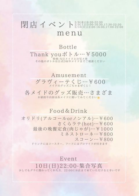 今週末の閉店イベントメニューになります𓂃🫧 最後に思いっきり楽しめるようイベントやフードやボトル、たくさん盛り込みました!たくさんの人にお会いできますように🌸 #グラヴィーテ #浜松 #メイド喫茶 #メイドカフェ #コンカフェ #豊橋 #閉店 https://t.co/X7PN6cMFet