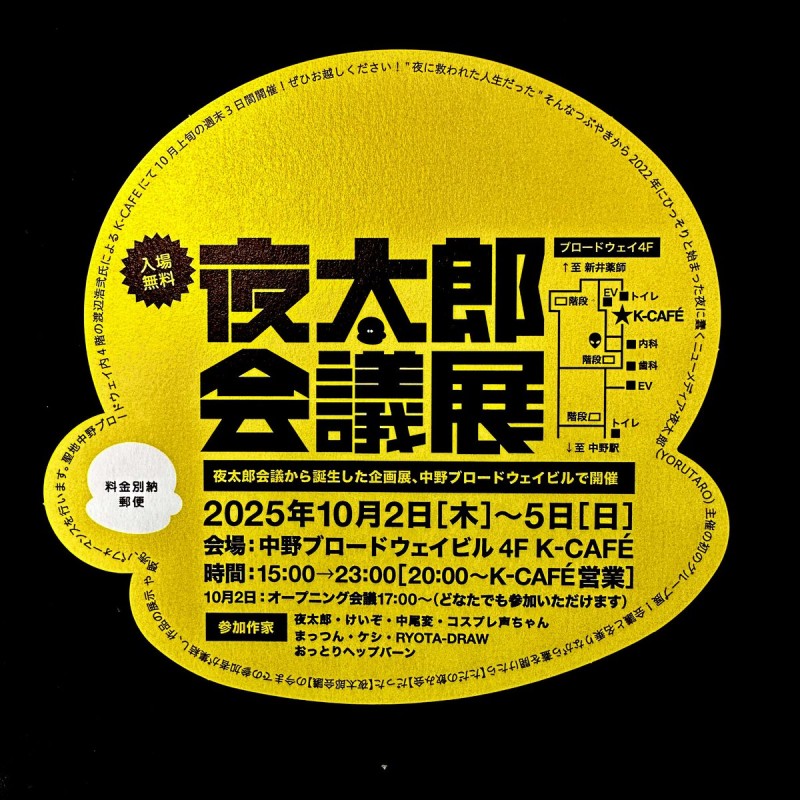 作家の渡辺浩弐さんのお店K-CAFEで開催されてる夜太郎会議展に行ってた!コーヒー飲みながらサブカルな会話に花が咲く楽しい空間だった!10/5(日)まで。合わせて購入した『中野ブロードウェイ怪談』にサインいただいてきました。本棚に置いてありますー
