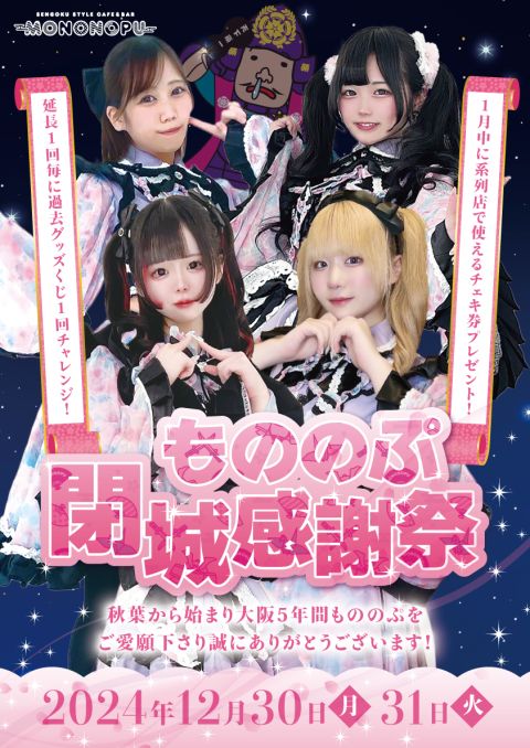 12/30~31【🌸もののぷ閉城感謝祭🏯】 ◤ ̄ ̄ ̄◥ も の 閉の 城ぷ 感 謝 祭 ◣___◢ 秋葉原ではじまり15年、大阪にて5年間、 もののぷをご愛願くださり、 誠にありがとうございました。 最終日まで、よろしくお願いいたします! https://t.co/LyiKO0og2H