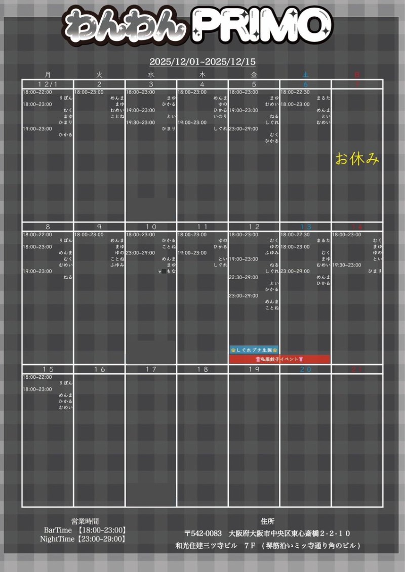 ━━━━━━━━━━━━━━━ 🐾わんわんPRIMO🐾 🦴12月前半お給仕予定🦴 ━━━━━━━━━━━━━━━ 🍶なくなり次第終了 甘酒イベント 🎂12日 しぐれプチお誕生日会 🥟12.13日 私服餃子イベント 沢山のご帰宅お待ちしております❕ https://t.co/IJ9VUFVCI5