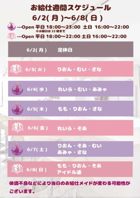 | 営業時間 | *火曜日~金曜日*18:00~23:00 *土曜日、日曜日*16:00~23:00 *月曜日、木曜日*定休日 (イベントなどで営業時間が変わることがあります。) | ||||||||||||||