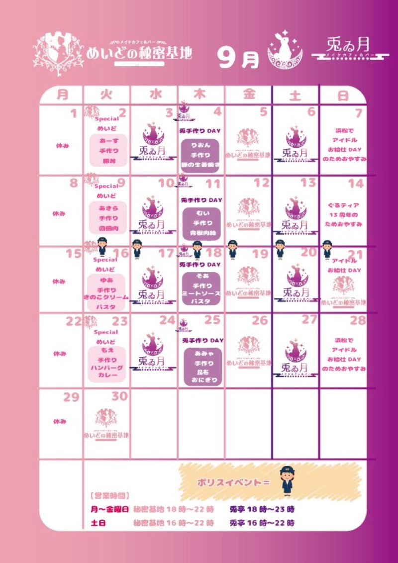 営業時間 | *火曜日~金曜日*18:00~23:00 *土曜日、日曜日*16:00~23:00 *月曜日、木曜日*定休日 (イベントなどで営業時間が変わることがあります。) | ||||||||||||||