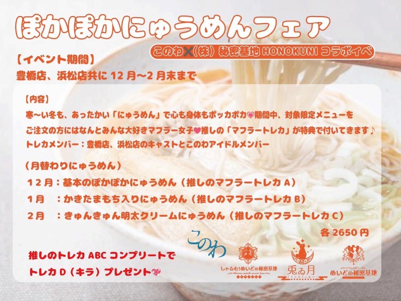 12月から2月まで月替わりのにゅうめんメニューを頼むとトレカがついてきます!