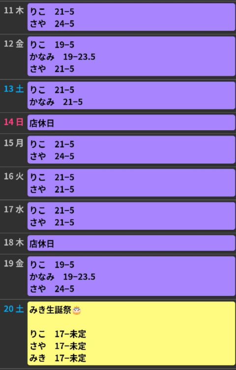 | 営業時間 | 19:00~5:00 | ||||||||||||||