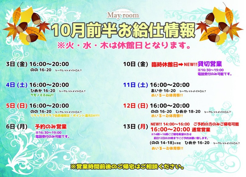ðïž10æ1æ¥ïœ15æ¥ å¶æ¥æ¥ïŒã¡ã€ããçµŠä»æ