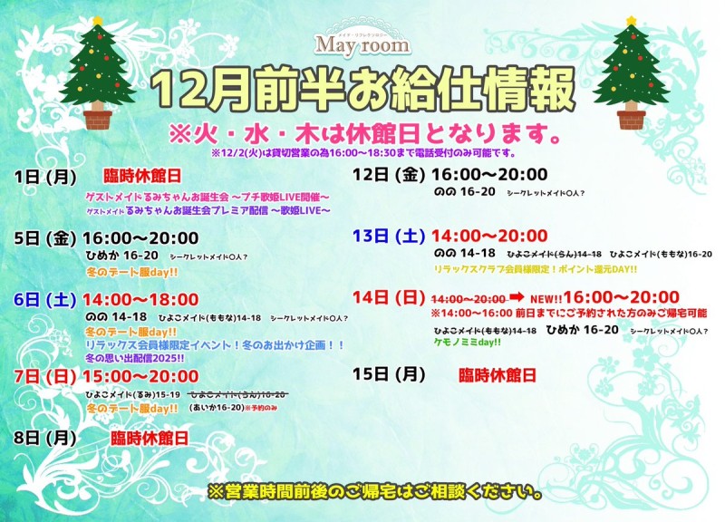 12/14(æ¥)14:00~16:00ã¯äºçŽã®ã¿å¶æ¥ãžå€æŽ(忥ãŸã§ã«äºçŽããé¡ãããŸãð«)16:00ã20:00ã¯éåžžå¶æ¥ãšãªããŸãð