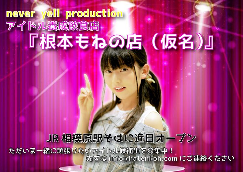| 紹介 | アニソン・コスプレ・アイドル・特撮大好きな女の子が集まる 新規オープンの現役アイドル根本もねの店です。 相模原市にサブカルを! 先日行われた2日間で10万人が集まった『さがみはらフェスタ2019』では 弊社がアニソンブースでは音響を担当し、コスプレブースを出して沢山のコスプレイヤーの方々にお越しいただきました。 いま、相模原はサブカルに力を入れてます! 芸能プロダクションのneveryellが経営するBARなので ニコ生の公式配信や、FMラジオ番組もお店からおこないます。 |