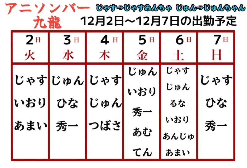 䞭目黒アニ゜ンバヌ九韍です 月曜日は定䌑日 日•火朚19時0時 金•土20時5時営業 今週の出勀予定です 12月20日(土) ★るなナり合同Birthday★ ボカロDay 幎末祭もありたす 今週も埅っおたす🐌 #アニメ #アニ゜ン #アニ゜ンバヌ #䞭目黒 #メむド #コスプレ #カラオケ https://t.co/nj64bU0WeY