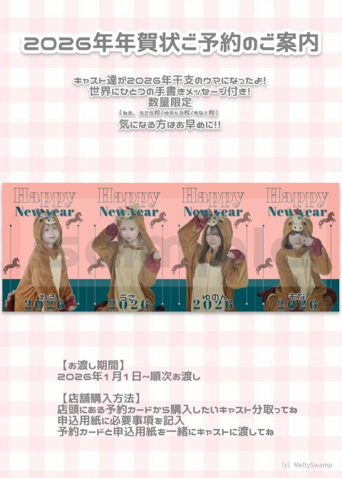 🎍メルスワ福袋&年賀状販売🐴 12/1(月)17:00〜店頭予約開始 12/8(月)0:00〜オンライン予約開始 今年もメルスワ福袋と年賀状販売‼️ 福袋¥5,000と年賀状¥1,000をセット購入で500円OFF 数量限定なのでお早めに! #コンカフェ #メルスワ #町田 https://t.co/c5rDDQemaw