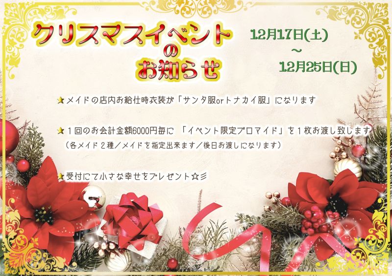 イベント期間12月17日(土) 〜 25日(日) イベント内容 メイドの店内お給仕時衣装が「サンタ服orトナカイ服」になります 1回のお会計金額6000円毎に 「イベント限定ブロマイド」を1枚お渡し致します (各メイド2種/メイドを指定出来ます/後日お渡しになります)  受付にて小さな幸せをプレゼント☆彡  2022年もいよいよ終盤ですね♪今年も、最後は恒例のこのイベントです(o^^o)クリスマス仕様の華やかなパルランテで、サンタやトナカイに扮したメイド達と楽しく過ごしましょう~(..>u<..)ご帰宅お待ちしております(*´ワ`*)