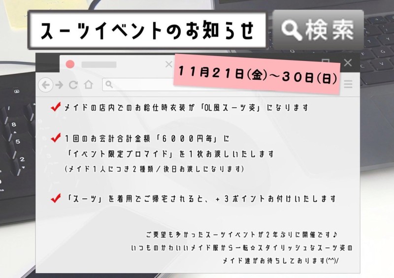 本日もご帰宅ありがとうございました💗 次の営業日時は 【11月23日】【12:00~22:00】 お留守番予定メイドは 🖤まりあ 🤍つばめ(16〜) でございます🎵 30日まで💻スーツイベント💻が開催中です✨ スーツ姿で皆様のご帰宅をお待ちしております☺️💓 https://t.co/Yf3tmhv1F9
