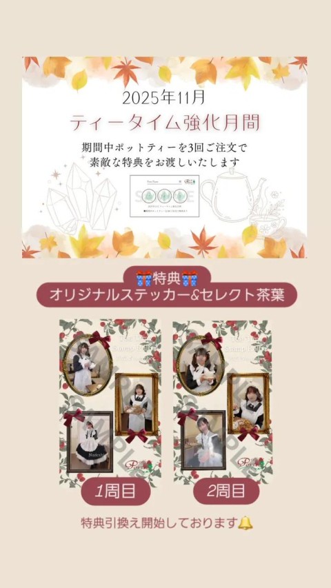 ご䞻人様・お嬢様 ごきげんよう🫖🍂 開通しおおりたす 11月23日(日) 【 OPEN 13:00CLOSE 19:00 】 LO FOOD 18:00 DRINKDESSERT 18:30 メヌプルフェア🍁過去䜜品の展瀺やアナログコミュノヌトづくり、🌠䌚ご予玄受付、🫖スタンプラリヌ開催䞭🎉 お垰りを心よりお埅ちしおおりたす🏡 https://t.co/o3Abb8EACF
