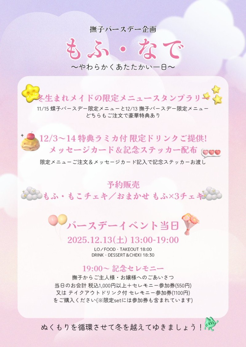 ご䞻人様・お嬢様 ごきげんよう🌞 開通しおおりたす❣ 12月13日(土) 撫子バヌスデヌ䌁画🧞🎂🎉もふ・なで☁ 【 OPEN 13:00CLOSE 19:00 】 LO FOOD 18:00 DRINKDESSERT 18:30 ✚🔔19:00より蚘念セレモニヌ🔔✚ お垰りを心よりお埅ちしおおりたす🏡 https://t.co/uAcGBKC72o