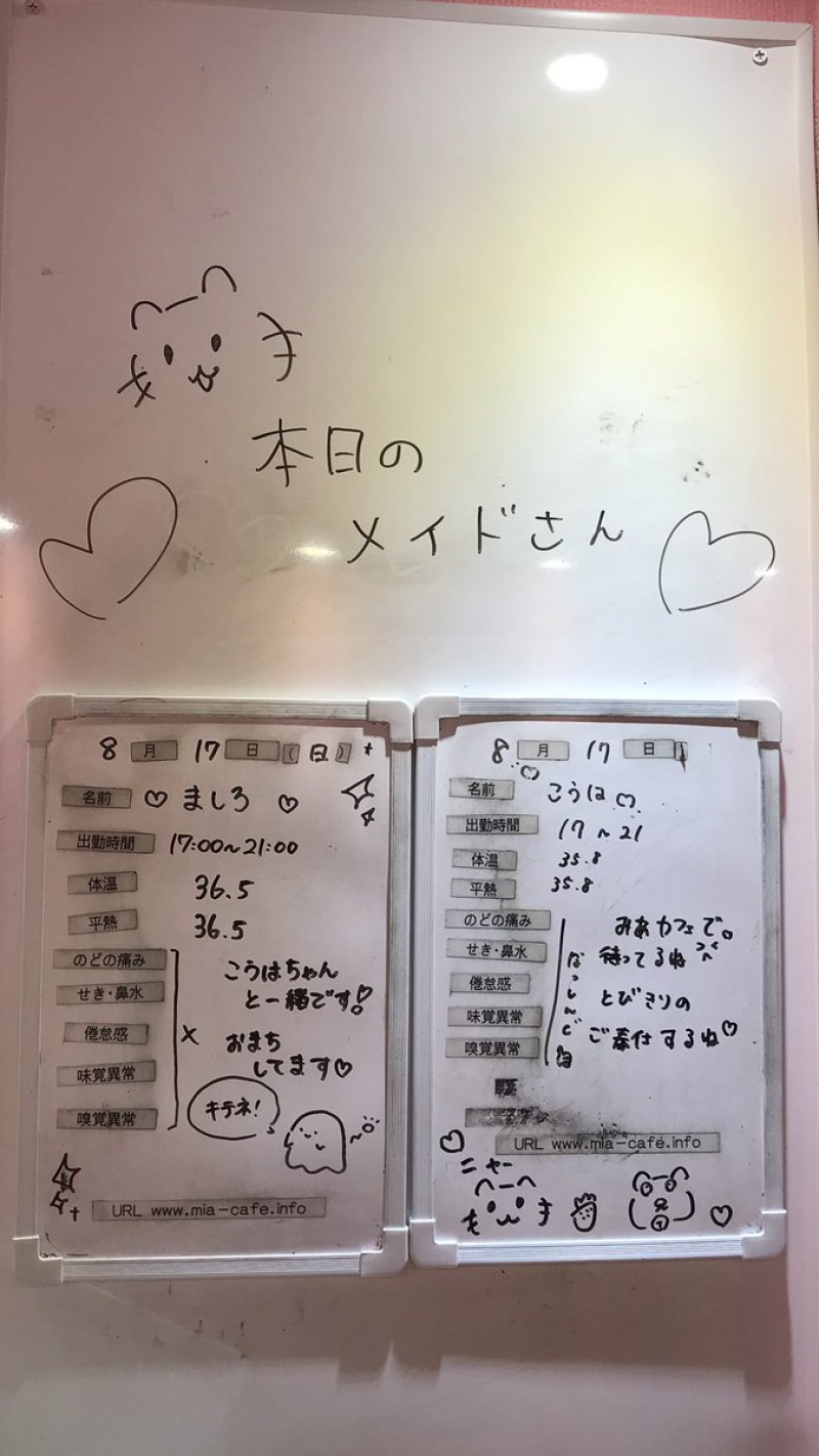 営業時間 | 静岡店は出勤スタッフがいれば営業です! 基本的に 12時~22時が営業時間です! ●静岡店のツイッター @shizuokamaidsan https://twitter.com/shizuokamaidsan ●ミア静岡店の営業曜日&営業時間● ☆月〜木 14:00〜22:00(最終受付20:00) ☆金曜日 12:00〜22:00(最終受付21:00) ☆土・日・祝 12:00〜22:00(最終受付21:00) 営業時間外はオンライン予約にてお願いいたします。 PC・携帯共通 → http://m-kanzume.moo.jp/yoyaku2/user.cgi ●ミアガイド出勤状況● スマホ・PC → 後日公開予定 ★静岡店スタッフによるミア甲府店でのメイドカフェリアル営業★ ☆不定期 サイトにてご確認ください。 http://market.chu.jp/schedule1/sche37.cgi | ||||||||||||||