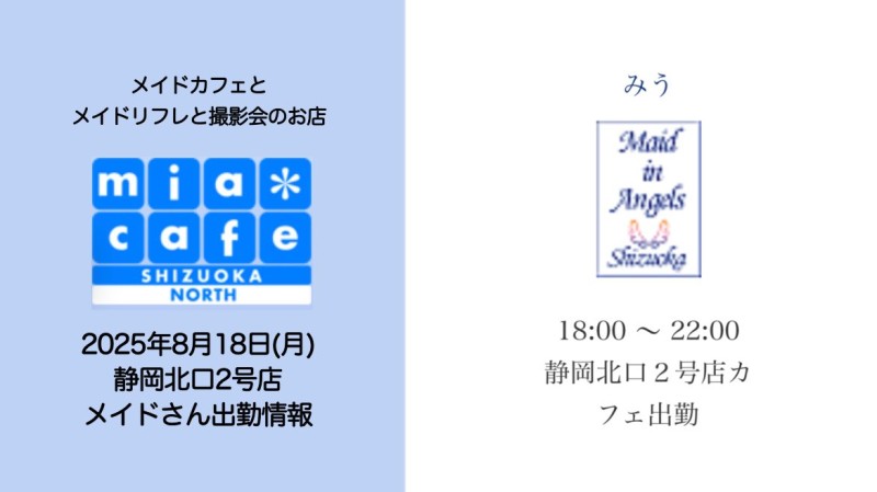 営業時間 | 静岡店は出勤スタッフがいれば営業です! 基本的に 12時~22時が営業時間です! ●静岡店のツイッター @shizuokamaidsan https://twitter.com/shizuokamaidsan ●ミア静岡店の営業曜日&営業時間● ☆月〜木 14:00〜22:00(最終受付20:00) ☆金曜日 12:00〜22:00(最終受付21:00) ☆土・日・祝 12:00〜22:00(最終受付21:00) 営業時間外はオンライン予約にてお願いいたします。 PC・携帯共通 → http://m-kanzume.moo.jp/yoyaku2/user.cgi ●ミアガイド出勤状況● スマホ・PC → 後日公開予定 ★静岡店スタッフによるミア甲府店でのメイドカフェリアル営業★ ☆不定期 サイトにてご確認ください。 http://market.chu.jp/schedule1/sche37.cgi | ||||||||||||||