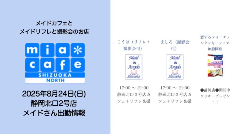 営業時間 | 静岡店は出勤スタッフがいれば営業です! 基本的に 12時~22時が営業時間です! ●静岡店のツイッター @shizuokamaidsan https://twitter.com/shizuokamaidsan ●ミア静岡店の営業曜日&営業時間● ☆月〜木 14:00〜22:00(最終受付20:00) ☆金曜日 12:00〜22:00(最終受付21:00) ☆土・日・祝 12:00〜22:00(最終受付21:00) 営業時間外はオンライン予約にてお願いいたします。 PC・携帯共通 → http://m-kanzume.moo.jp/yoyaku2/user.cgi ●ミアガイド出勤状況● スマホ・PC → 後日公開予定 ★静岡店スタッフによるミア甲府店でのメイドカフェリアル営業★ ☆不定期 サイトにてご確認ください。 http://market.chu.jp/schedule1/sche37.cgi | ||||||||||||||