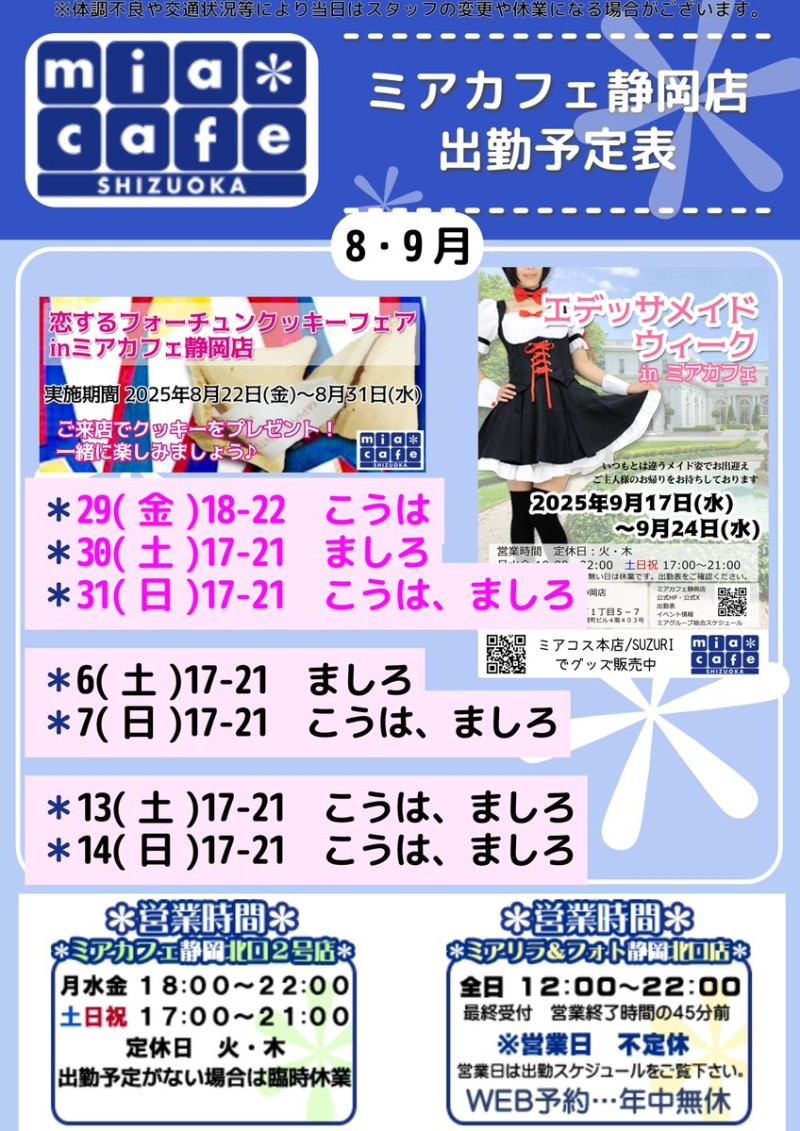 営業時間 | 静岡店は出勤スタッフがいれば営業です! 基本的に 12時~22時が営業時間です! ●静岡店のツイッター @shizuokamaidsan https://twitter.com/shizuokamaidsan ●ミア静岡店の営業曜日&営業時間● ☆月〜木 14:00〜22:00(最終受付20:00) ☆金曜日 12:00〜22:00(最終受付21:00) ☆土・日・祝 12:00〜22:00(最終受付21:00) 営業時間外はオンライン予約にてお願いいたします。 PC・携帯共通 → http://m-kanzume.moo.jp/yoyaku2/user.cgi ●ミアガイド出勤状況● スマホ・PC → 後日公開予定 ★静岡店スタッフによるミア甲府店でのメイドカフェリアル営業★ ☆不定期 サイトにてご確認ください。 http://market.chu.jp/schedule1/sche37.cgi | ||||||||||||||
