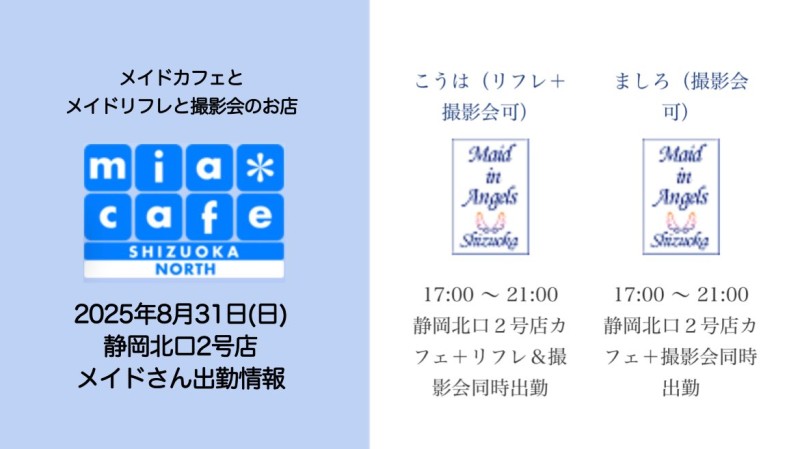 営業時間 | 静岡店は出勤スタッフがいれば営業です! 基本的に 12時~22時が営業時間です! ●静岡店のツイッター @shizuokamaidsan https://twitter.com/shizuokamaidsan ●ミア静岡店の営業曜日&営業時間● ☆月〜木 14:00〜22:00(最終受付20:00) ☆金曜日 12:00〜22:00(最終受付21:00) ☆土・日・祝 12:00〜22:00(最終受付21:00) 営業時間外はオンライン予約にてお願いいたします。 PC・携帯共通 → http://m-kanzume.moo.jp/yoyaku2/user.cgi ●ミアガイド出勤状況● スマホ・PC → 後日公開予定 ★静岡店スタッフによるミア甲府店でのメイドカフェリアル営業★ ☆不定期 サイトにてご確認ください。 http://market.chu.jp/schedule1/sche37.cgi | ||||||||||||||