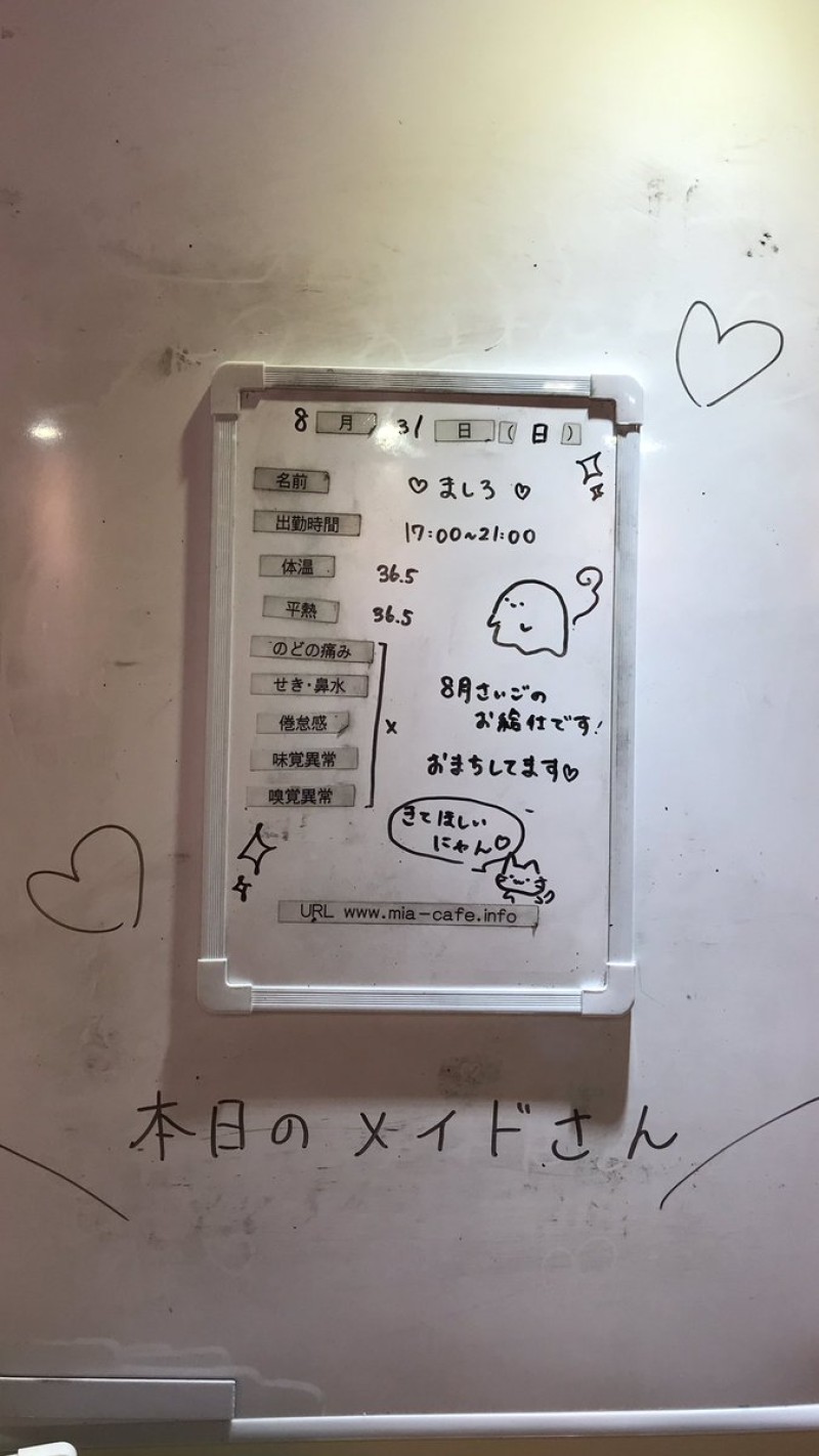 営業時間 | 静岡店は出勤スタッフがいれば営業です! 基本的に 12時~22時が営業時間です! ●静岡店のツイッター @shizuokamaidsan https://twitter.com/shizuokamaidsan ●ミア静岡店の営業曜日&営業時間● ☆月〜木 14:00〜22:00(最終受付20:00) ☆金曜日 12:00〜22:00(最終受付21:00) ☆土・日・祝 12:00〜22:00(最終受付21:00) 営業時間外はオンライン予約にてお願いいたします。 PC・携帯共通 → http://m-kanzume.moo.jp/yoyaku2/user.cgi ●ミアガイド出勤状況● スマホ・PC → 後日公開予定 ★静岡店スタッフによるミア甲府店でのメイドカフェリアル営業★ ☆不定期 サイトにてご確認ください。 http://market.chu.jp/schedule1/sche37.cgi | ||||||||||||||