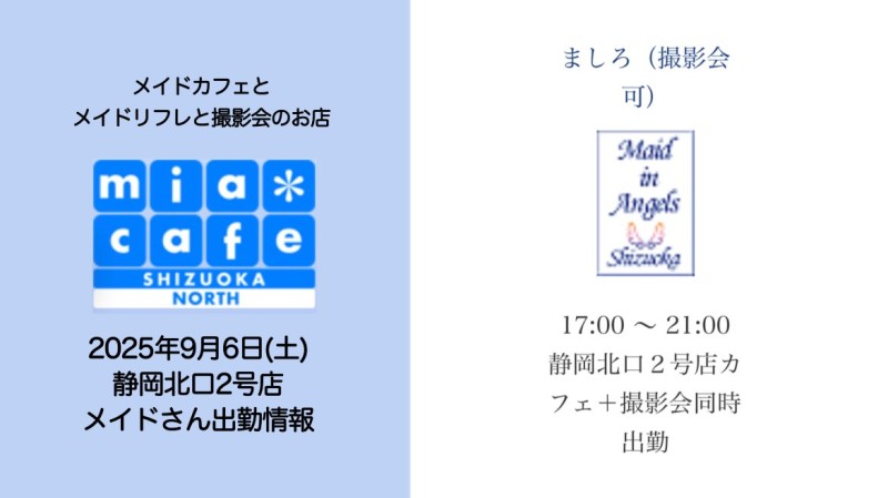 営業時間 | 静岡店は出勤スタッフがいれば営業です! 基本的に 12時~22時が営業時間です! ●静岡店のツイッター @shizuokamaidsan https://twitter.com/shizuokamaidsan ●ミア静岡店の営業曜日&営業時間● ☆月〜木 14:00〜22:00(最終受付20:00) ☆金曜日 12:00〜22:00(最終受付21:00) ☆土・日・祝 12:00〜22:00(最終受付21:00) 営業時間外はオンライン予約にてお願いいたします。 PC・携帯共通 → http://m-kanzume.moo.jp/yoyaku2/user.cgi ●ミアガイド出勤状況● スマホ・PC → 後日公開予定 ★静岡店スタッフによるミア甲府店でのメイドカフェリアル営業★ ☆不定期 サイトにてご確認ください。 http://market.chu.jp/schedule1/sche37.cgi | ||||||||||||||
