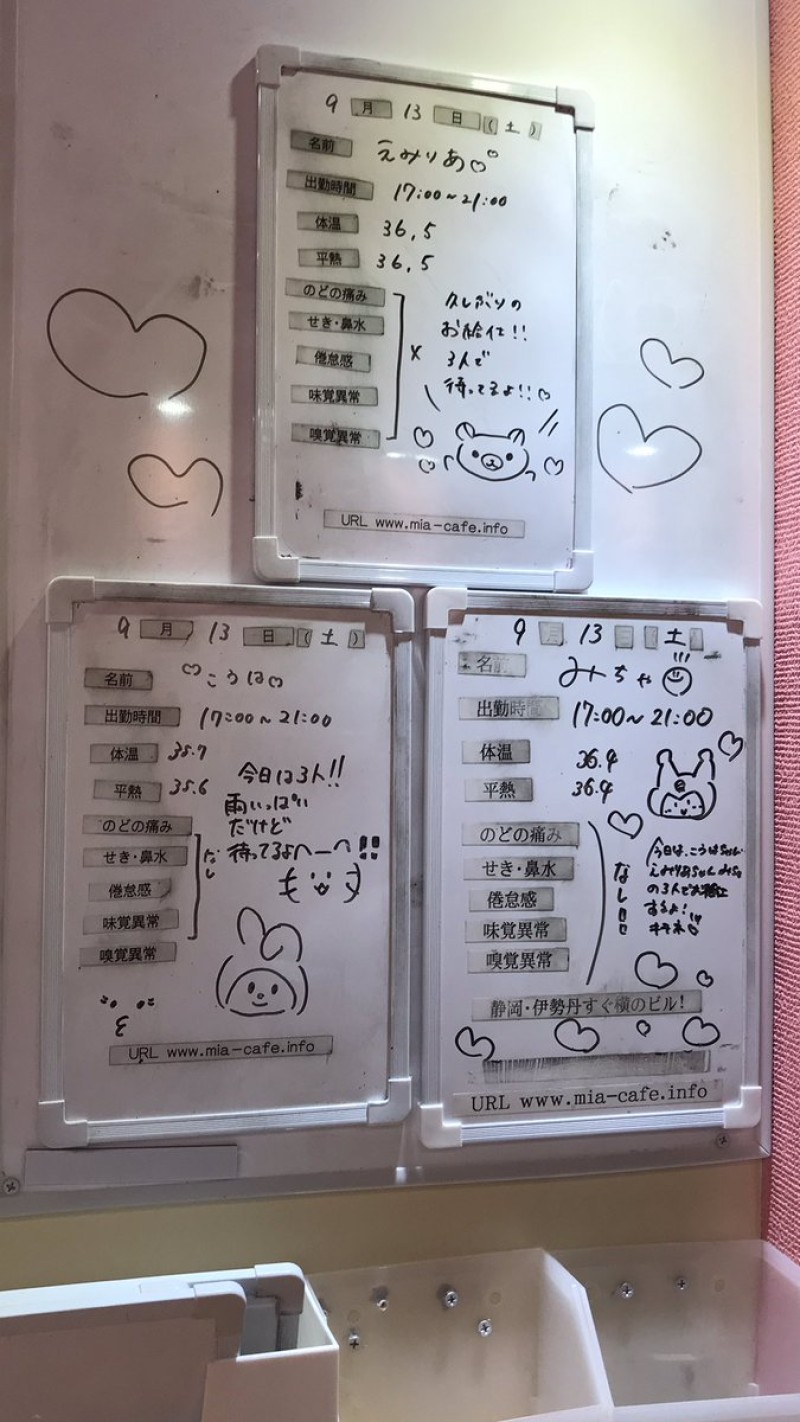 営業時間 | 静岡店は出勤スタッフがいれば営業です! 基本的に 12時~22時が営業時間です! ●静岡店のツイッター @shizuokamaidsan https://twitter.com/shizuokamaidsan ●ミア静岡店の営業曜日&営業時間● ☆月〜木 14:00〜22:00(最終受付20:00) ☆金曜日 12:00〜22:00(最終受付21:00) ☆土・日・祝 12:00〜22:00(最終受付21:00) 営業時間外はオンライン予約にてお願いいたします。 PC・携帯共通 → http://m-kanzume.moo.jp/yoyaku2/user.cgi ●ミアガイド出勤状況● スマホ・PC → 後日公開予定 ★静岡店スタッフによるミア甲府店でのメイドカフェリアル営業★ ☆不定期 サイトにてご確認ください。 http://market.chu.jp/schedule1/sche37.cgi | ||||||||||||||