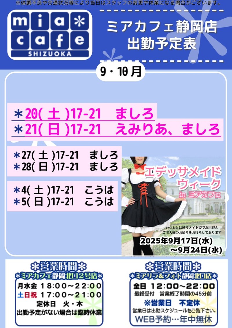 営業時間 | 静岡店は出勤スタッフがいれば営業です! 基本的に 12時~22時が営業時間です! ●静岡店のツイッター @shizuokamaidsan https://twitter.com/shizuokamaidsan ●ミア静岡店の営業曜日&営業時間● ☆月〜木 14:00〜22:00(最終受付20:00) ☆金曜日 12:00〜22:00(最終受付21:00) ☆土・日・祝 12:00〜22:00(最終受付21:00) 営業時間外はオンライン予約にてお願いいたします。 PC・携帯共通 → http://m-kanzume.moo.jp/yoyaku2/user.cgi ●ミアガイド出勤状況● スマホ・PC → 後日公開予定 ★静岡店スタッフによるミア甲府店でのメイドカフェリアル営業★ ☆不定期 サイトにてご確認ください。 http://market.chu.jp/schedule1/sche37.cgi | ||||||||||||||