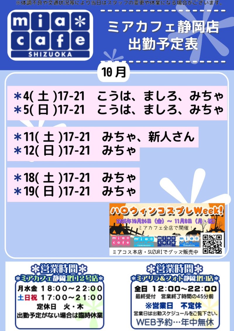 営業時間 | 静岡店は出勤スタッフがいれば営業です! 基本的に 12時~22時が営業時間です! ●静岡店のツイッター @shizuokamaidsan https://twitter.com/shizuokamaidsan ●ミア静岡店の営業曜日&営業時間● ☆月〜木 14:00〜22:00(最終受付20:00) ☆金曜日 12:00〜22:00(最終受付21:00) ☆土・日・祝 12:00〜22:00(最終受付21:00) 営業時間外はオンライン予約にてお願いいたします。 PC・携帯共通 → http://m-kanzume.moo.jp/yoyaku2/user.cgi ●ミアガイド出勤状況● スマホ・PC → 後日公開予定 ★静岡店スタッフによるミア甲府店でのメイドカフェリアル営業★ ☆不定期 サイトにてご確認ください。 http://market.chu.jp/schedule1/sche37.cgi | ||||||||||||||