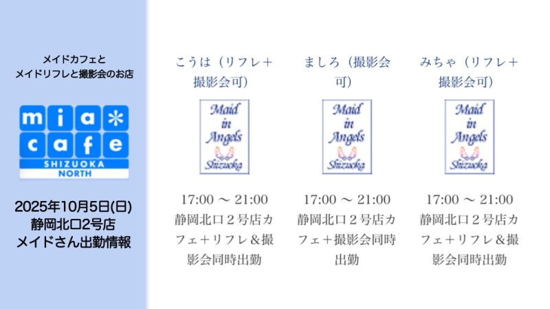 営業時間 | 静岡店は出勤スタッフがいれば営業です! 基本的に 12時~22時が営業時間です! ●静岡店のツイッター @shizuokamaidsan https://twitter.com/shizuokamaidsan ●ミア静岡店の営業曜日&営業時間● ☆月〜木 14:00〜22:00(最終受付20:00) ☆金曜日 12:00〜22:00(最終受付21:00) ☆土・日・祝 12:00〜22:00(最終受付21:00) 営業時間外はオンライン予約にてお願いいたします。 PC・携帯共通 → http://m-kanzume.moo.jp/yoyaku2/user.cgi ●ミアガイド出勤状況● スマホ・PC → 後日公開予定 ★静岡店スタッフによるミア甲府店でのメイドカフェリアル営業★ ☆不定期 サイトにてご確認ください。 http://market.chu.jp/schedule1/sche37.cgi | ||||||||||||||