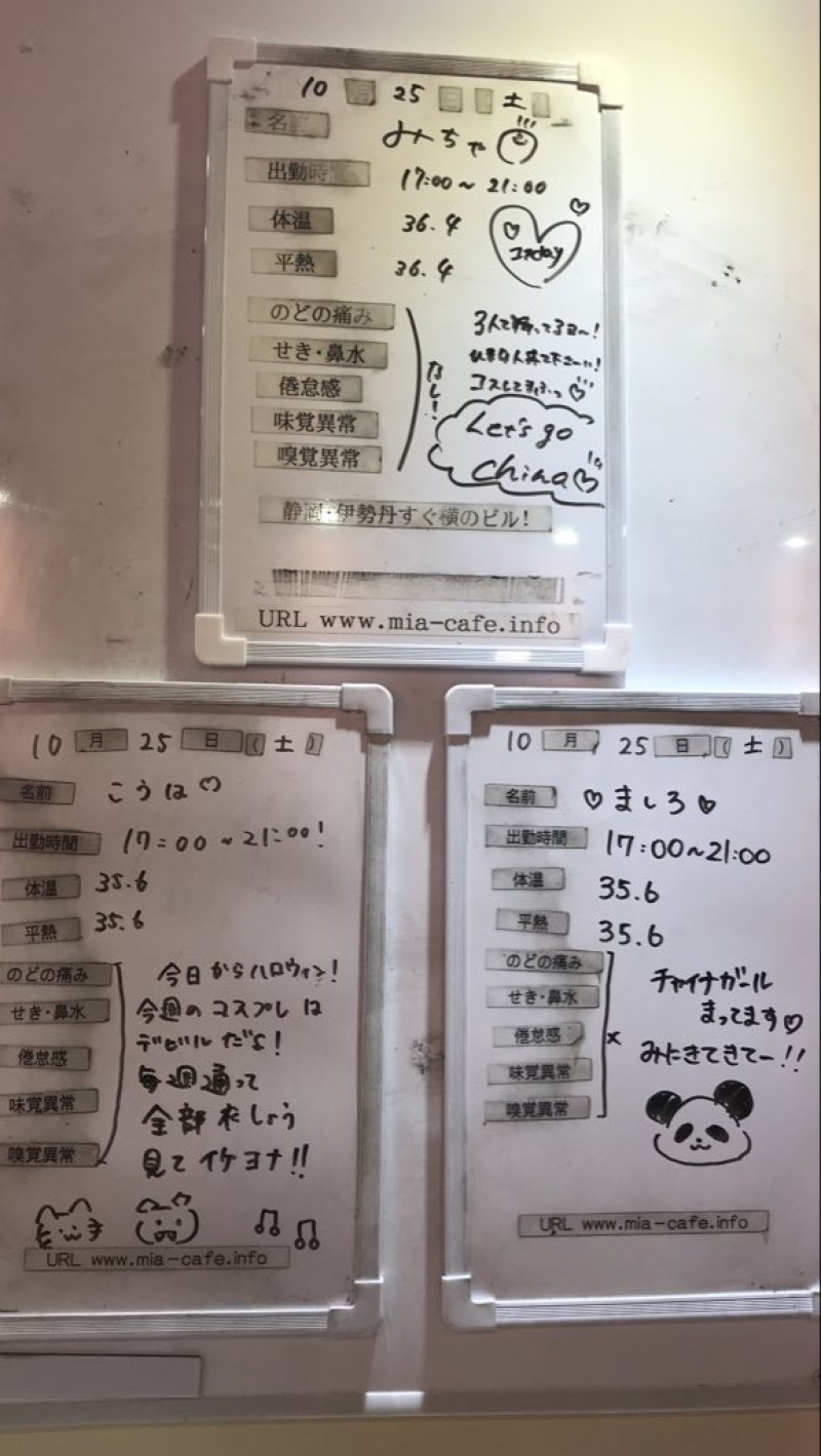 | 営業時間 | 静岡店は出勤スタッフがいれば営業です! 基本的に 12時~22時が営業時間です! ●静岡店のツイッター @shizuokamaidsan https://twitter.com/shizuokamaidsan ●ミア静岡店の営業曜日&営業時間● ☆月〜木 14:00〜22:00(最終受付20:00) ☆金曜日 12:00〜22:00(最終受付21:00) ☆土・日・祝 12:00〜22:00(最終受付21:00) 営業時間外はオンライン予約にてお願いいたします。 PC・携帯共通 → http://m-kanzume.moo.jp/yoyaku2/user.cgi ●ミアガイド出勤状況● スマホ・PC → 後日公開予定 ★静岡店スタッフによるミア甲府店でのメイドカフェリアル営業★ ☆不定期 サイトにてご確認ください。 http://market.chu.jp/schedule1/sche37.cgi | ||||||||||||||