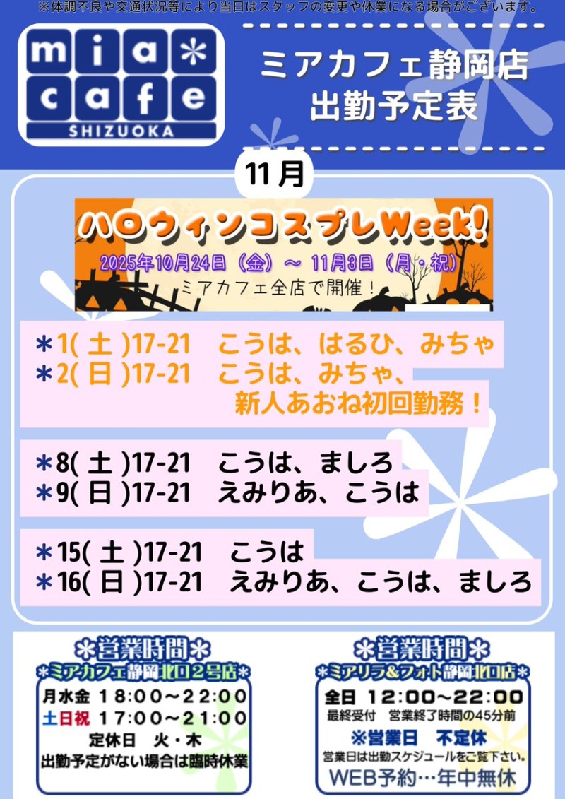 🎃11月2日(日) 17-21 🔰あおね初回勤務🔰,こうは,みちゃ