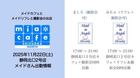 | 営業時間 | 静岡店は出勤スタッフがいれば営業です! 基本的に 12時~22時が営業時間です! ●静岡店のツイッター @shizuokamaidsan https://twitter.com/shizuokamaidsan ●ミア静岡店の営業曜日&営業時間● ☆月〜木 14:00〜22:00(最終受付20:00) ☆金曜日 12:00〜22:00(最終受付21:00) ☆土・日・祝 12:00〜22:00(最終受付21:00) 営業時間外はオンライン予約にてお願いいたします。 PC・携帯共通 → http://m-kanzume.moo.jp/yoyaku2/user.cgi ●ミアガイド出勤状況● スマホ・PC → 後日公開予定 ★静岡店スタッフによるミア甲府店でのメイドカフェリアル営業★ ☆不定期 サイトにてご確認ください。 http://market.chu.jp/schedule1/sche37.cgi | ||||||||||||||