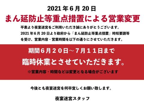 政府から6月21日から7月11日までは、まん延防止等重点措置の時短要請等に変更を受け、営業時間や内容を変更になりましたのでご報告致します。 https://t.co/NqLhmBGXjX