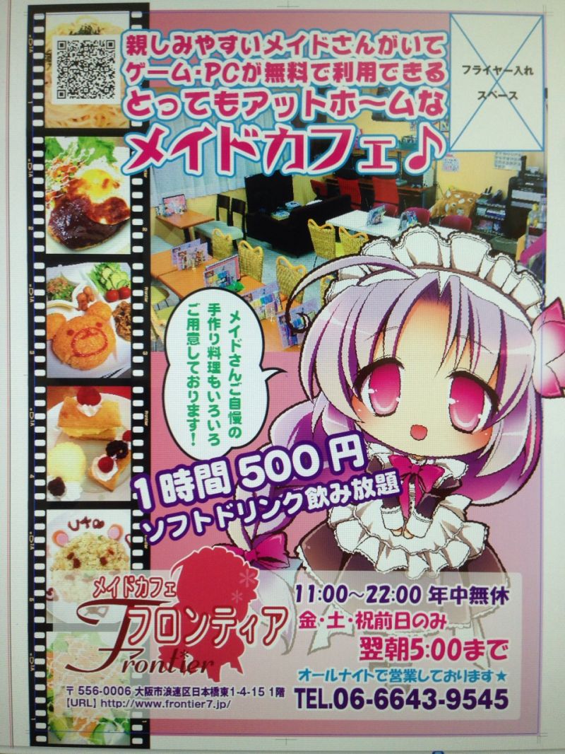 | 紹介 | 2010年6月19日にオープンしました。明るい綺麗な店内でアットホームな感じのお店です。オールタイム1時間500円でソフトドリンクが飲み放題。PCも無料で利用出来ます。メイドさん手作りのフードやお菓子が食べられます。メイドさんに歌リクエストが可能です。メイドたちがご主人様、お嬢様のご帰宅をお待ちしております♪ | ||||||||||||||||||||||||